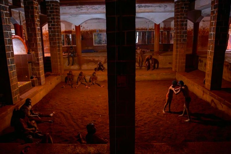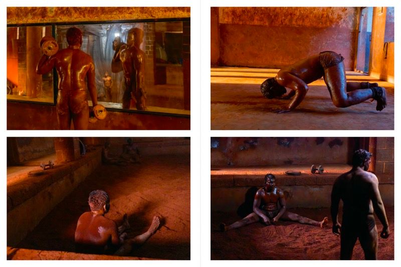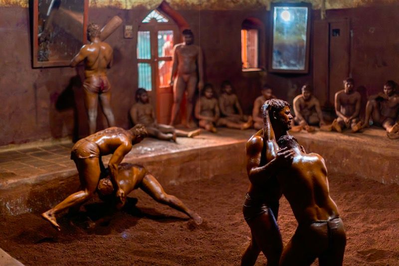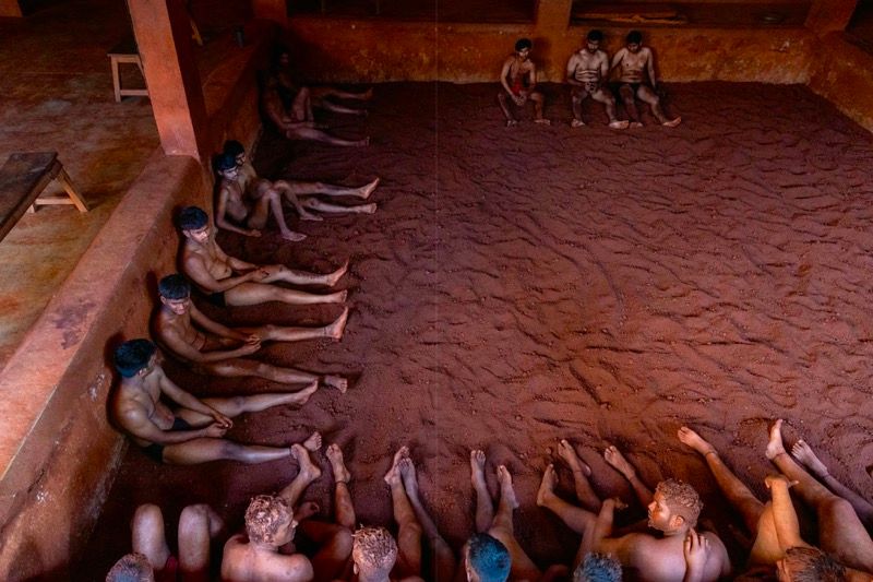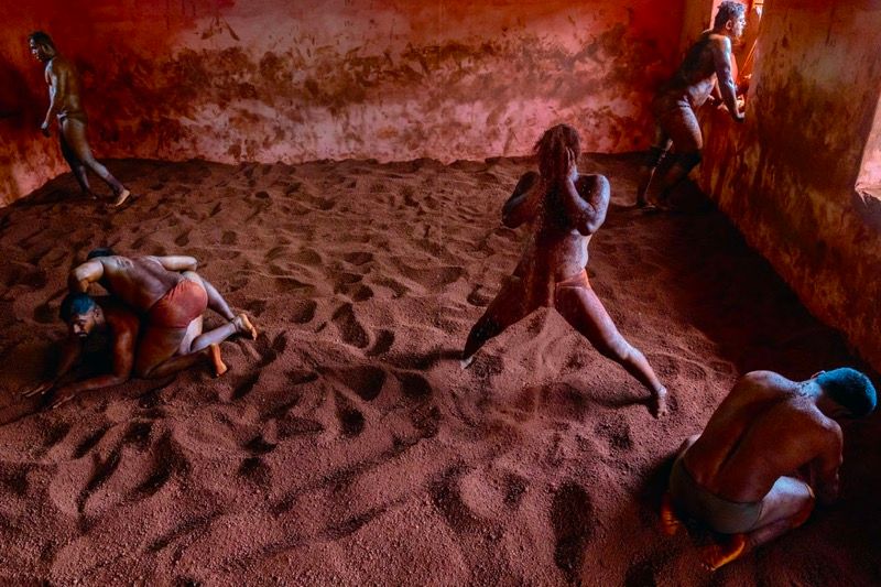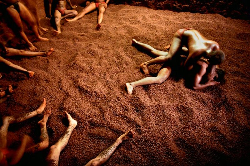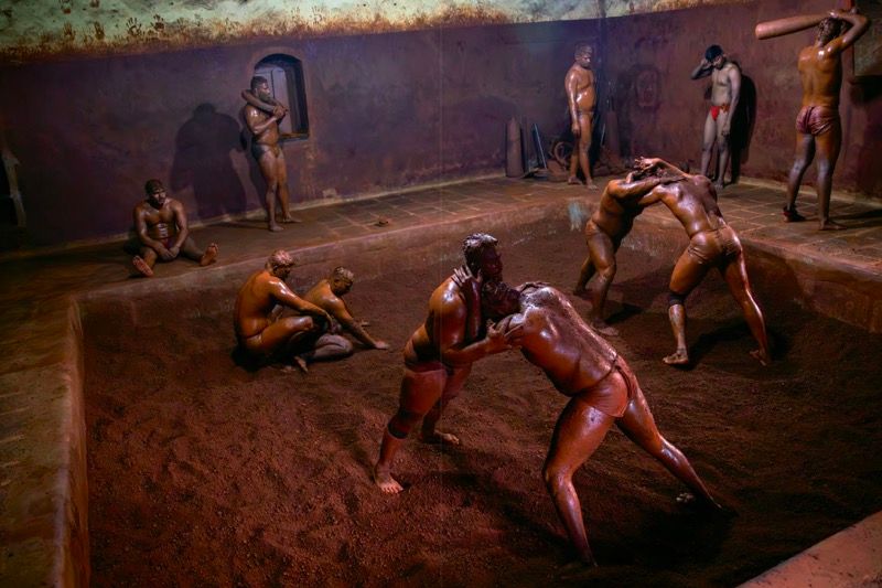 Jejich život se dávno zúžil na zápas. Mimo něj už nestojí na tomto světě o nic. Žádné bohatství, doteky ani city. Nevlastní majetek, jen rohož na spaní, trenýrky, tričko a deku. Ranní trénink začíná kolem čtvrté. Temně rudou hmotou – napůl hlínou a napůl pískem – si zápasníci potírají tělo. Brzy se smísí s potem a oni věří, že je ochrání, že má léčivé účinky. Jsou vzkříšením golemů – siláků stvořených z hlíny. Trénink končí úplným vyčerpáním. Zbytek dne prospí všichni pohromadě na svých rohožích a na jediném ubohém vařiči si ohřívají rýži. A zítra nanovo. Takový je po staletí neměnný svět zápasníků kuští v zapomenutém městě Kólhálpuru na jihozápadě Indie.